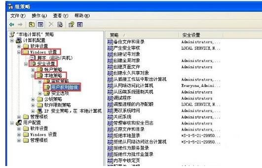 进入到组策略管理窗口后,依次点击打开左侧选项中的Windows设置/安全设置/本地策略/用户权利指派