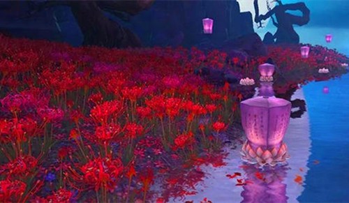 在黄泉路上有火红的彼岸花。彼岸花是一般认为是生长在三途河边的接引之花。在那儿大批大批的开着这花,远远看上去就像是血所铺成的地毯,又因其橙的似火而被喻为“火照之路”也是这长长黄泉路上唯一的风景与色彩。人就踏着这花的指引通向幽冥之狱。花香传说有魔力,能唤起死者生前的记忆。走过黄泉路后,有一条河叫忘川河,上有一座桥叫奈何桥。走过奈何桥有一个土台叫望乡台,望乡台边有个老妇人在卖孟婆汤,忘川河边有一块石头叫三生石,孟婆汤让你忘了一切,三生石记载着你的前世今生。