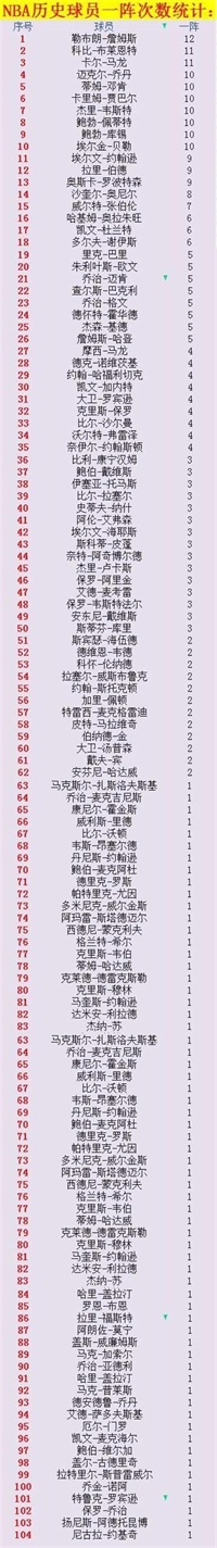 NBA历史一阵球员一阵次数排名:总计104人