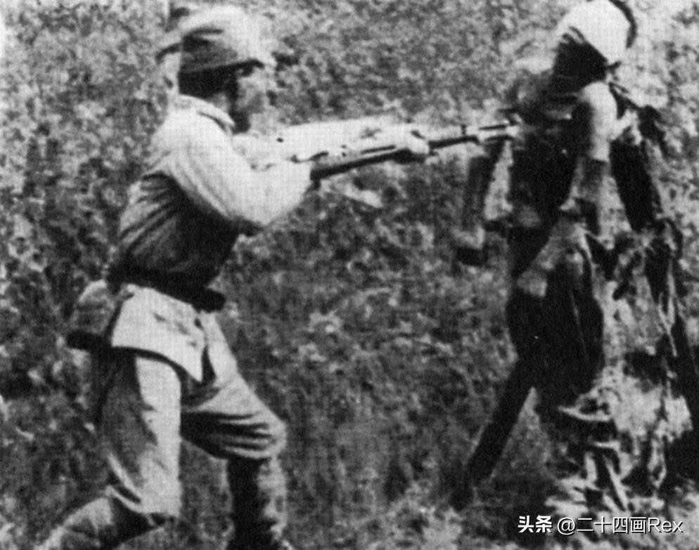 这个可怜的人被蒙住眼睛靠在两根棍子上,充当日军练习刺刀的活靶子。