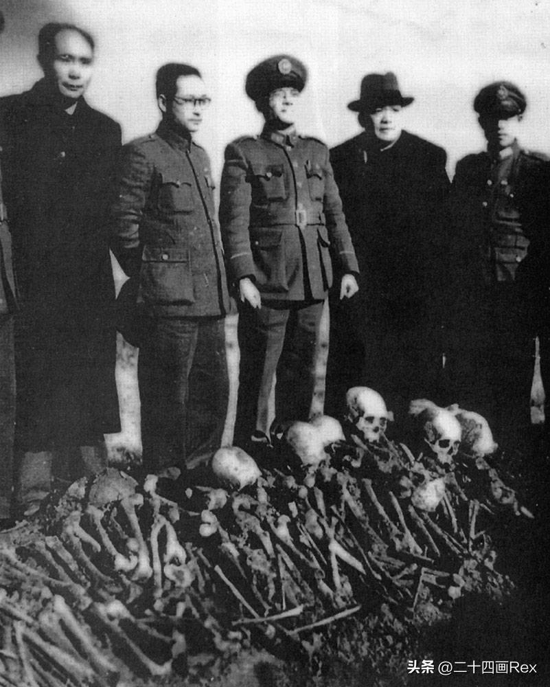 1946年战犯审判期间,从很多坟墓中出土的尸骨,供中国官员查验。