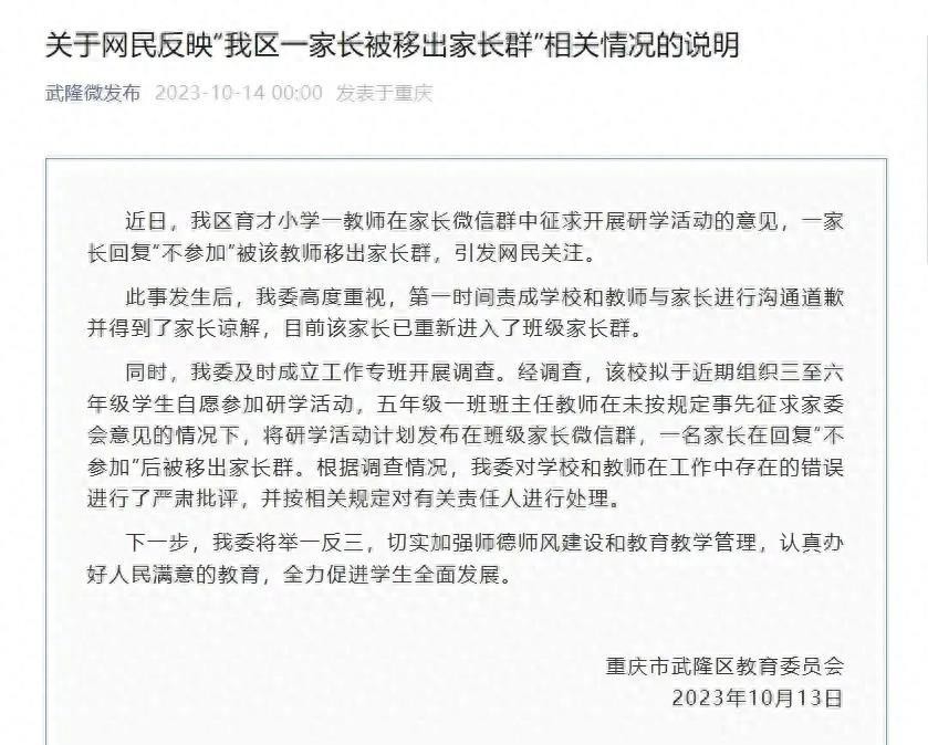 这种做法不仅不尊重家长的权益,也没有充分考虑到家长可能有各种原因无法参加研学活动。这种单方面决定的做法,容易引发家长的不满和抵触情绪,从而影响了学校和家长的良好关系。教育事业是一个复杂而庞大的系统。家长、学校和教师的合作与共同努力才能够推动教育事业的发展。在这个事件中,武隆区教委对学校和教师存在的错误进行了严肃批评,并按相关规定对有关责任人进行了处理。通过此事件的处理,不仅能够让各方更加意识到研学活动的重要性和学校与家长的合作关系,也能够为今后类似事件的处理提供借鉴和参考。