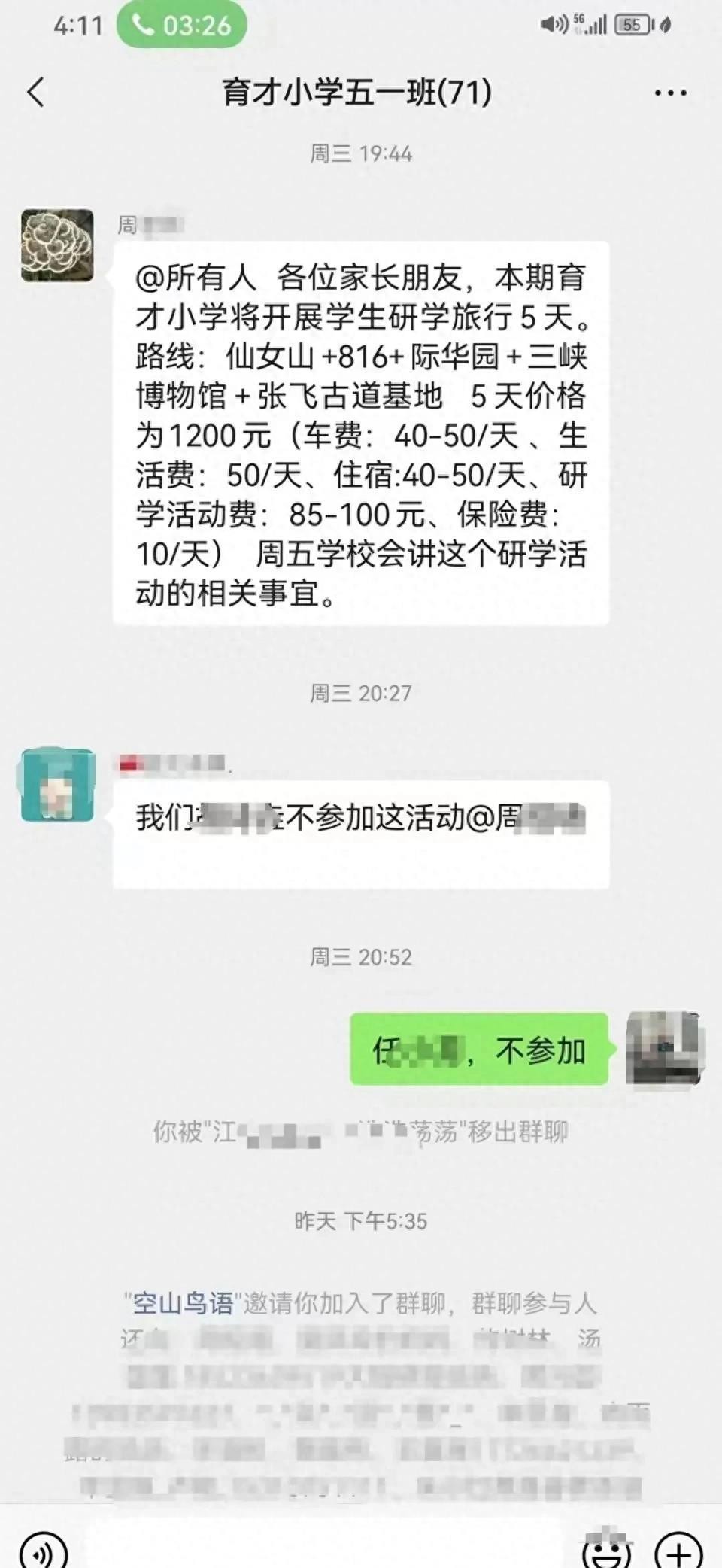 研学活动引发家长争议:学校应该征求意见还是家长应该积极参与?研学活动作为一种新型的教育模式,受到了许多人的关注。然而,最近在武隆区育才小学发生的一起事件,引发了广泛的关注和争议。五年级一班班主任教师在未事先征求家委会意见的情况下发布活动计划,一名家长回复“不参加”后竟遭到移出家长群的待遇。这一情况引发了极大的争议和不满。这个事件再次引发了公众对于学校和教师在执行研学活动时应注重征求家长意见的讨论。同时,也有人对于家长拒绝参加研学活动的行为提出了质疑。对于研学活动的意义,人们有着不同的看法。