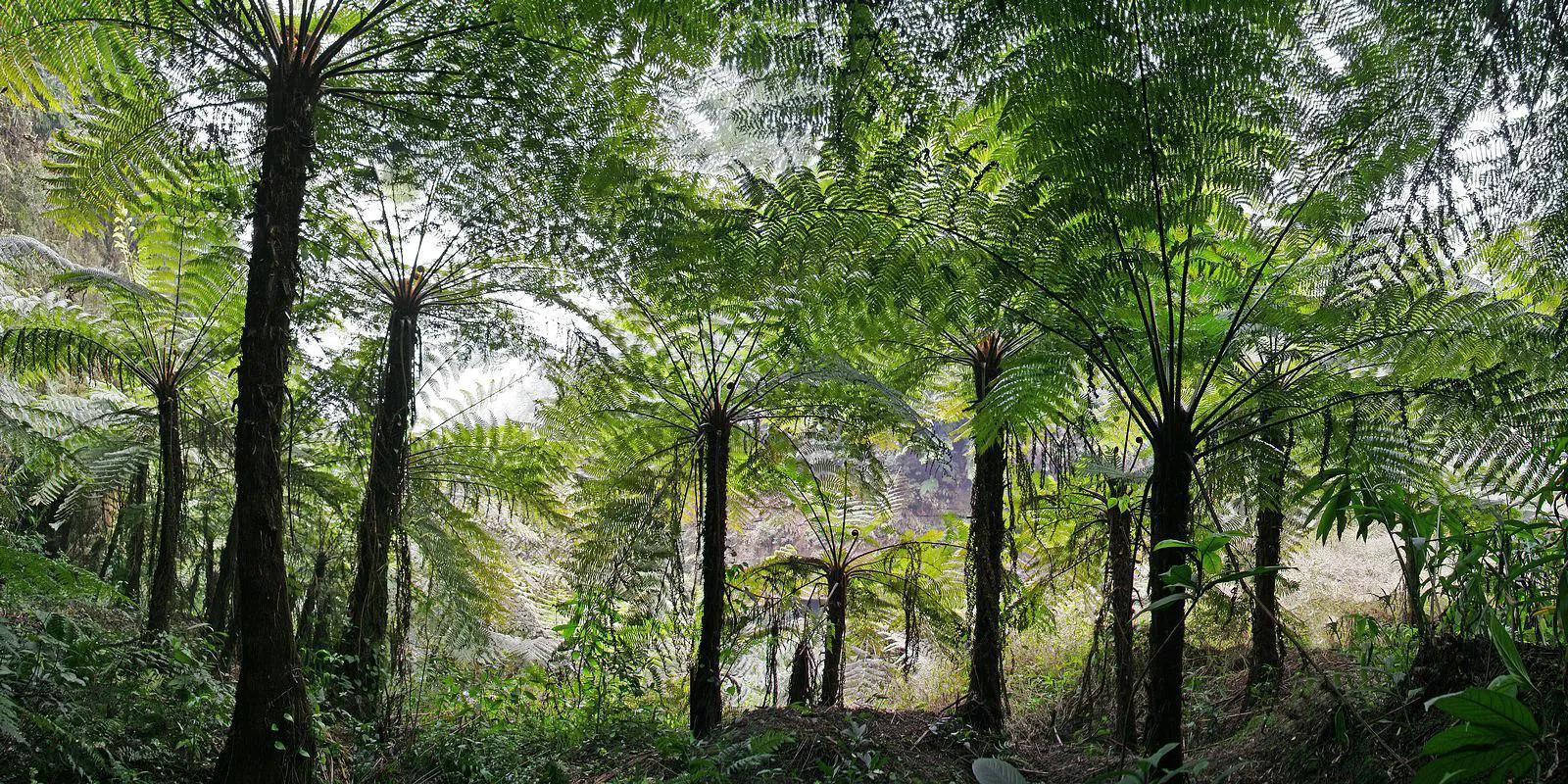 桫椤,高3~8米,叶柄与叶轴为暗紫色,密深小刺,叶片长1~3m,三回羽状分裂,以螺旋方式排列,生于山地溪傍或疏林中,海拔260~1600m。