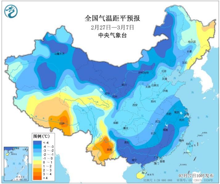经济观察网讯 据中央气象台 2 月 27 日消息,未来 10 天,黄淮南部、江汉、江淮、江南、华南及贵州东部、重庆、西藏东南部等地累计降水量有 15~30 毫米,部分地区 40~70 毫米,局地可达 100 毫米以上;西北地区大部、华北、东北、黄淮北部累计降水量有 3~8 毫米,青海东南部、甘肃南部、陕西南部等地的部分地区有 10~20 毫米;上述大部地区降水量较常年同期偏多 4~7 成,局地偏多 1 倍以上。未来 10 天,除东北地区北部、云南大部、西藏等地平均气温较常年同期偏高 2 ℃左右外,我国其余大部地区平均气温较常年同期偏低 1~3 ℃,其中西北地区、华北北部、江西、华南及贵州南部等地的部分地区偏低 4 ℃左右。