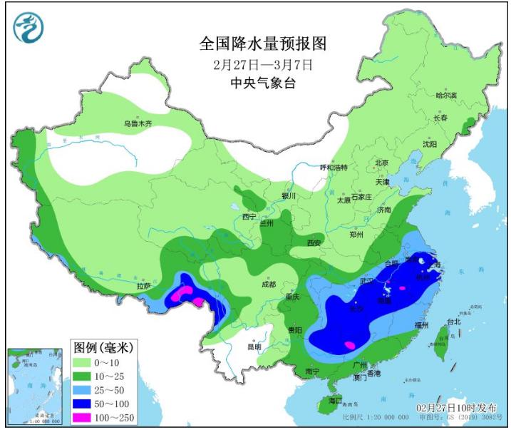 未来 10 天(2 月 27 日— 3 月 7 日),黄淮南部、江汉、江淮、江南、华南及贵州东部、重庆、西藏东南部等地累计降水量有 15~30 毫米,部分地区 40~70 毫米,局地可达 100 毫米以上;西北地区大部、华北、东北、黄淮北部累计降水量有 3~8 毫米,青海东南部、甘肃南部、陕西南部等地的部分地区有 10~20 毫米;上述大部地区降水量较常年同期偏多 4~7 成,局地偏多 1 倍以上。