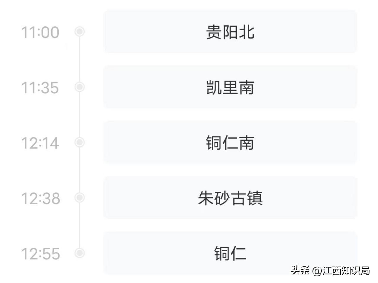 本次列车11:00从贵阳北出发,12:55到达铜仁,中间一共停靠3站(详情见图),全程336公里,运行时长1小时55分钟。列车由成都局贵阳客运段担当,型号为和谐号380D-1548型动车组。