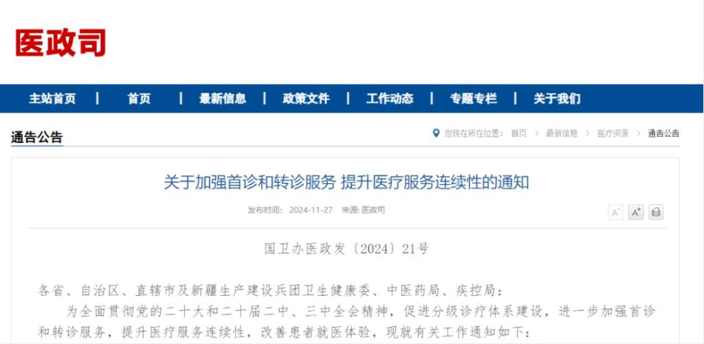 11月27日,国家卫生健康委发布《关于加强首诊和转诊服务 提升医疗服务连续性的通知》。国家卫生健康委医政司司长焦雅辉在国家卫生健康委“加强首诊和转诊服务 推进医疗机构检查检验结果互认”新闻发布会上介绍,“医疗机构要设立转诊中心,或指定固定职能部门承担患者转诊服务工作,强化转诊服务的统一管理。”