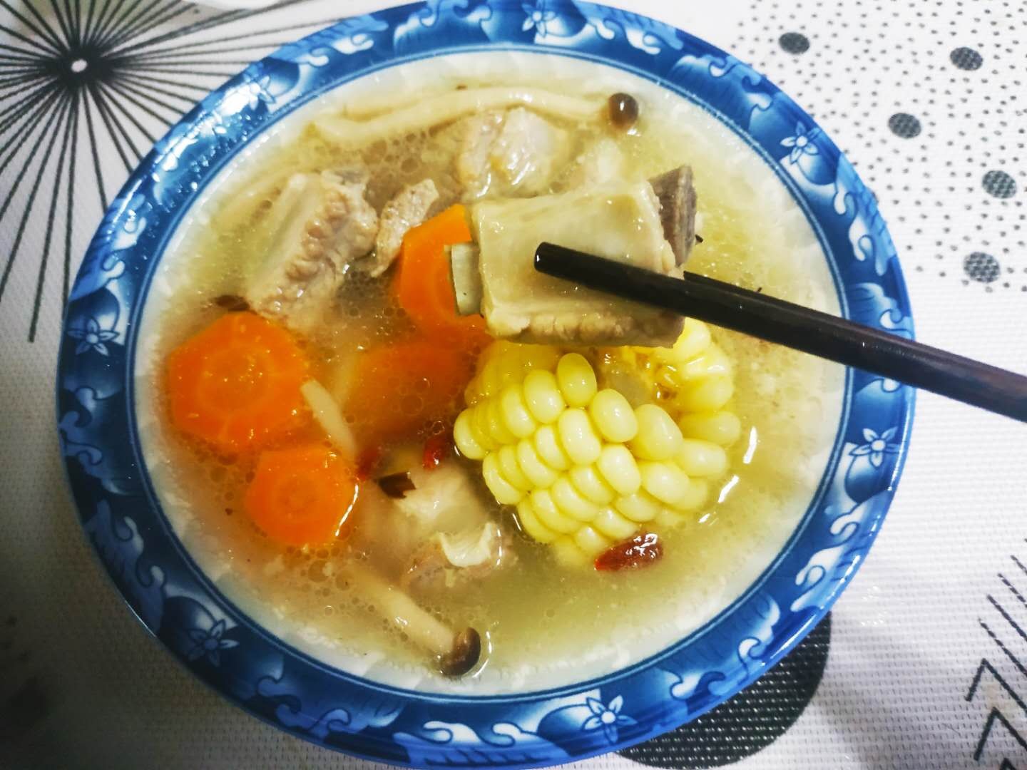 食材;猪小排450克,胡萝卜一根,玉米一根,海鲜菇适量,枸杞子适量,盐,姜葱,料酒适量。