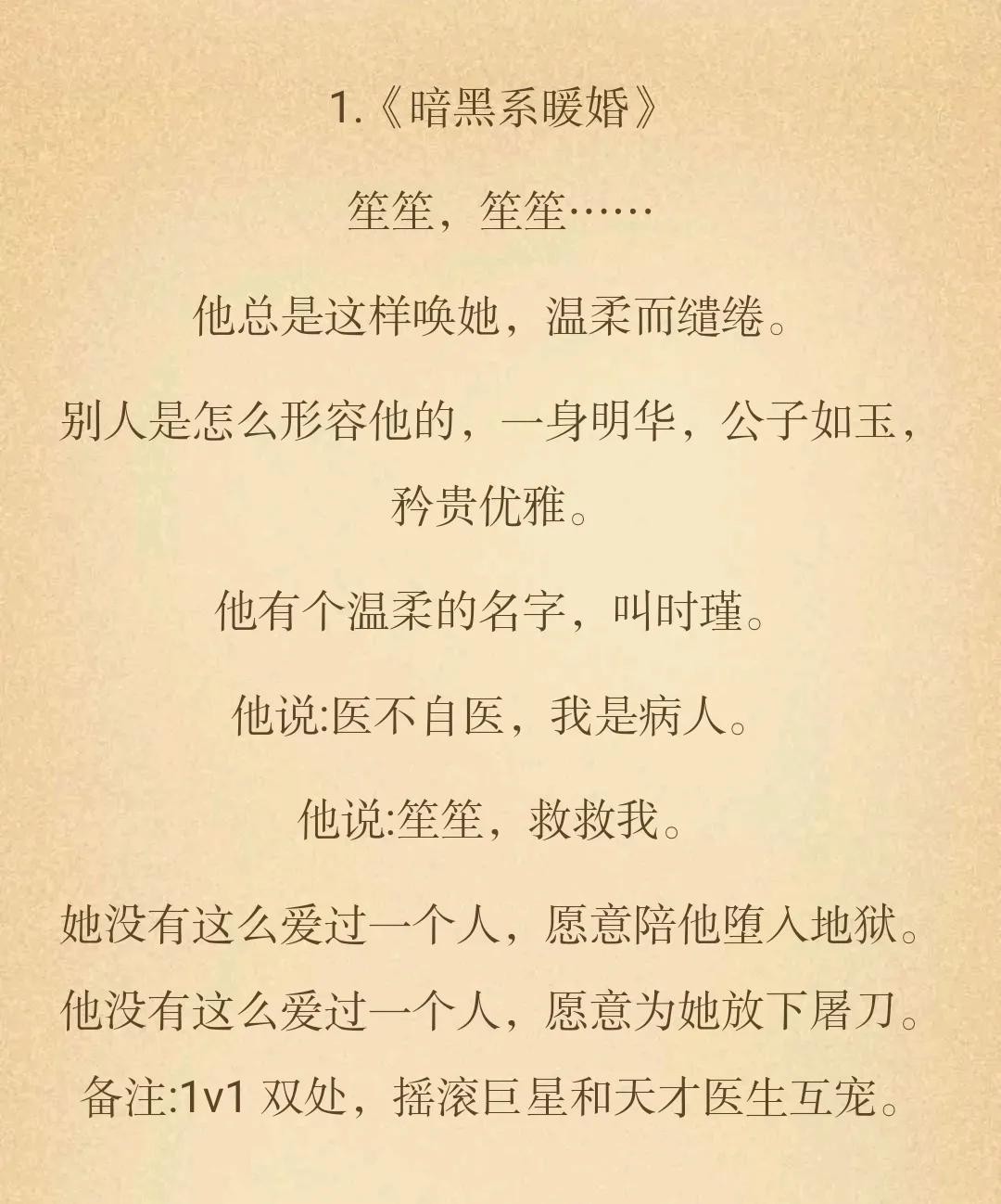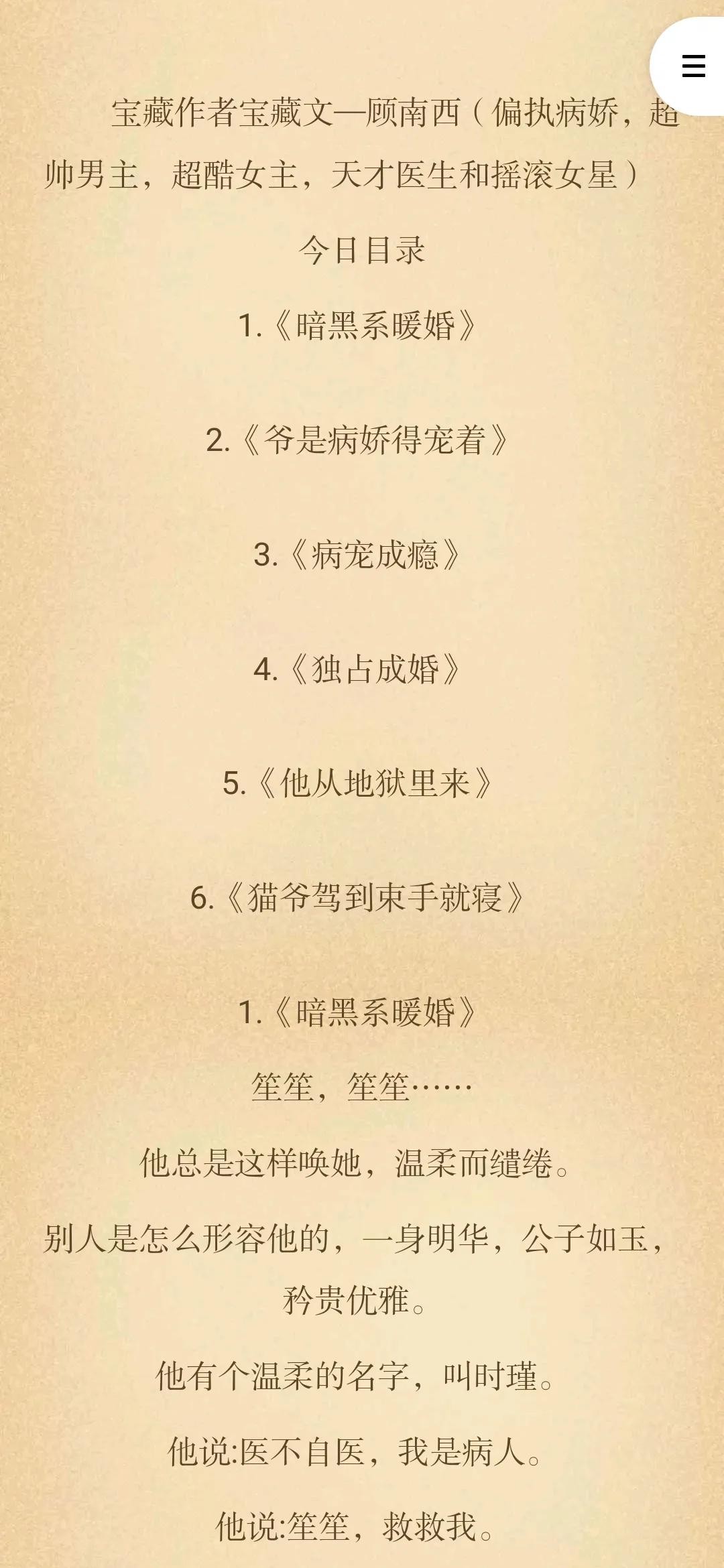 有很长一段时间不太喜欢看比较长的文,没耐性看完,直到看到《暗黑系暖婚》,不止看完了,还是追完的!!!然后后来又不止看了一遍。有一对主CP,和其它几对副CP,副CP的故事番外里也写了,就是宇文让我非常意难平。看了《暗黑系暖婚》之后就去搜她其他的文 发现我之前还看过《病宠成瘾》,今天发完这篇想去重新看一下《猫爷驾到束手就寝》