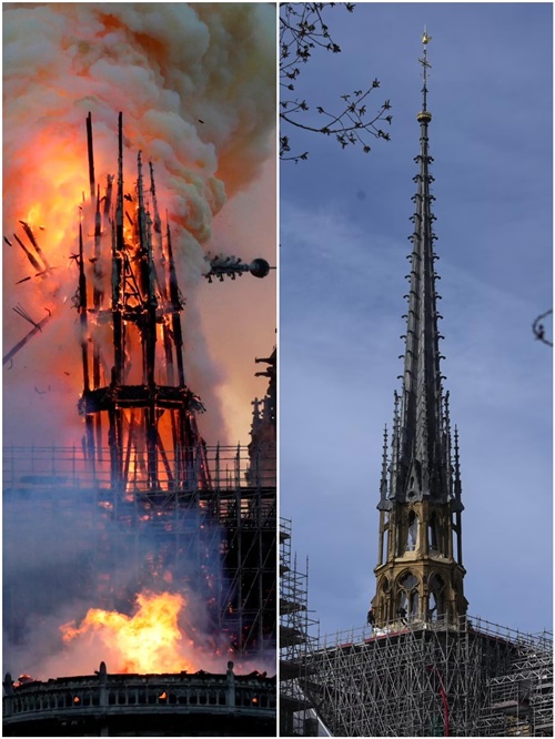 被烧毁的木质屋顶有“森林”之称,它由约1300根古橡木梁交织而成。大火后,修复者遍寻法国数千棵成材的橡树,织就了新的“森林”。唐安悦介绍,法国遗产修复专家团参照了19世纪的原始设计图纸,并效仿传统工艺,力求恢复原貌。