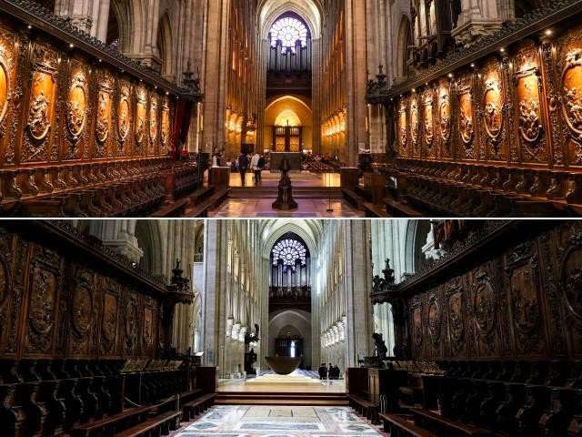 法国巴黎圣母院发生火灾前(上,2018年6月26日摄)和修复后(下,2024年11月29日摄)的内部景象。新华社发