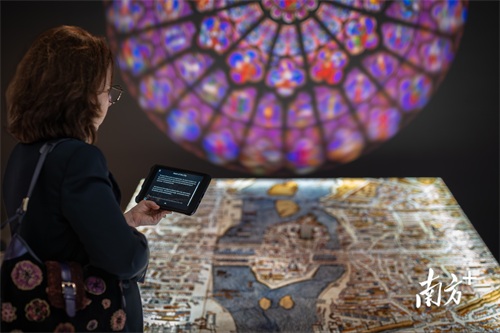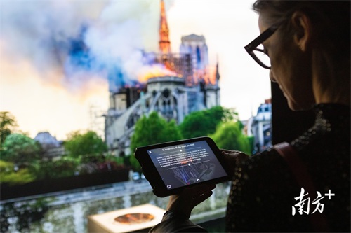 香港展览中,游客通过平板电脑重温巴黎圣母院起火的那一刻。策展方供图