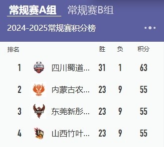 常规赛积分表部分截图。来自WCBA官网