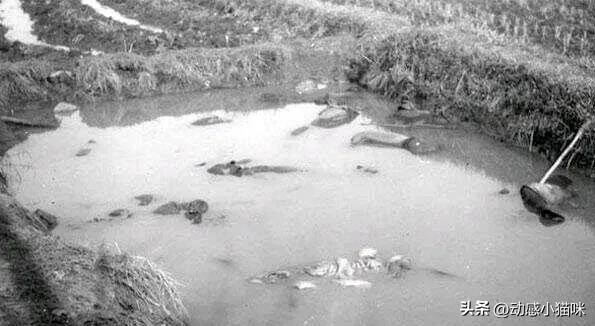3、在农村的一个小池塘里面,一些物品漂浮在上面,这是一些被日军杀害的老百姓,日军将他们杀害以后,将他们的尸体直接扔到了池塘里面。