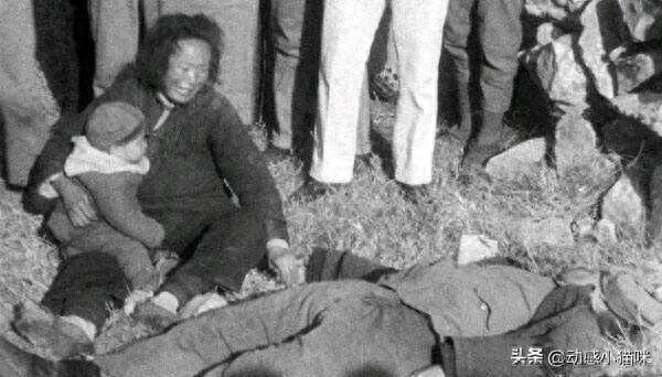 1、一个男子被日军杀死,尸体躺在地上,在边上有很多人正在围观,一个妇女怀里抱着一个婴儿,坐在尸体边上伤心的哭泣着。