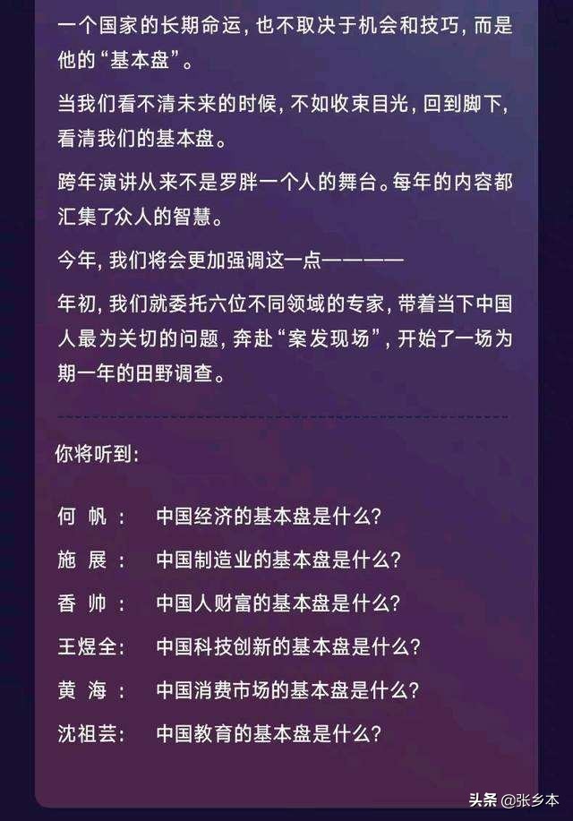 不过跨年演讲来看,这几年还是非常成功的,你看看它的人气,以及它越来越多的赞助商,也能够感觉到这个节目至少目前来说,是在走上坡路的。今年的跨年演讲,应该来说,也算是成功的。罗胖他是比较善于抓住线索的,今年的主要线索,就是围绕着报告来做。而这报告是本来就有了的,罗胖他们要做的事情,就是通过各种词语,各种脉络来串联起这几分报告,其实说白一点,罗胖就用了一个关键词,就串联起来了这几分报告,那就是“我辈中人”。从基本盘到消费市场新机会,再到钱从哪里来,又到教育,到科技,到制造业优势,最后再总结一下这个时代,罗胖今年跨年演讲的工作,算得上简单又明了。