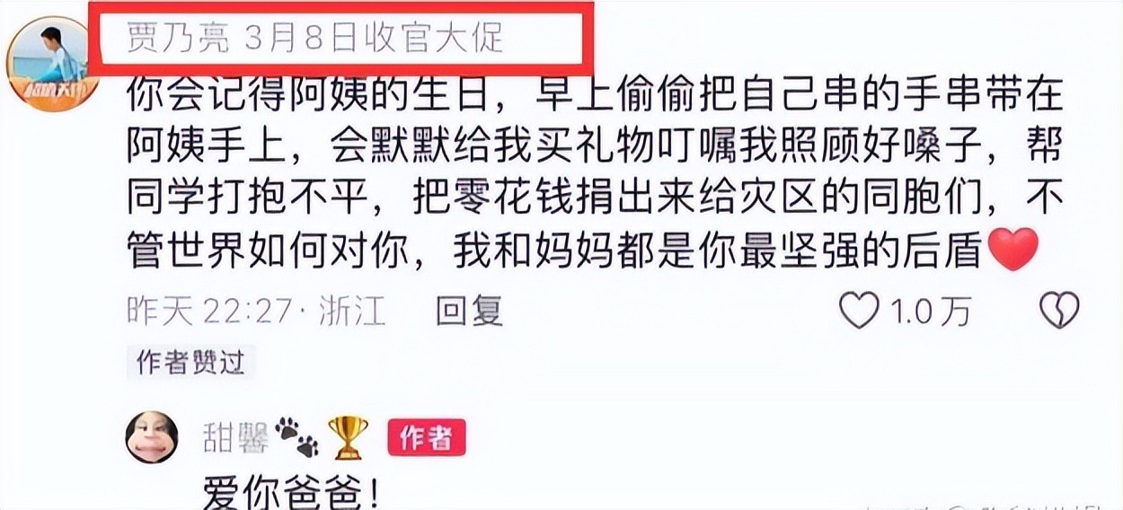 贾乃亮表面上为女儿说话,但账号上还明晃晃写着几个大字:3月8日收官大促。