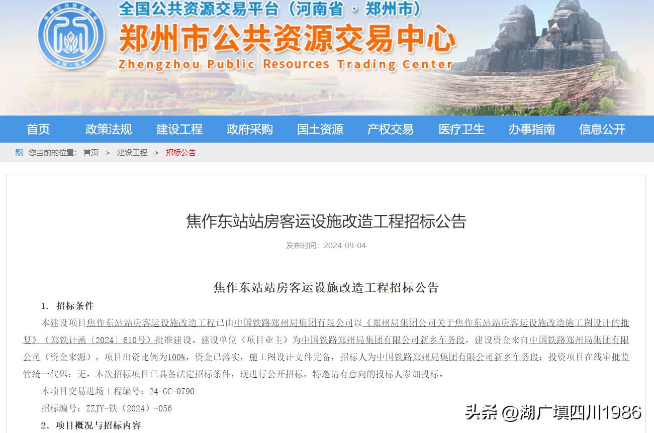 2024年9月4日,中国铁路郑州局集团有限公司发布了焦作东站站房客运设施改造工程招标公告,工程的主要内容是:焦作东站站房客运设施改造工程主要含增设客运广播、视频监控、安检设施、检票闸机、电子客票、旅服系统等;电力按需增容;电力、通信、暖通、给排水、消防、标识等配套改造。