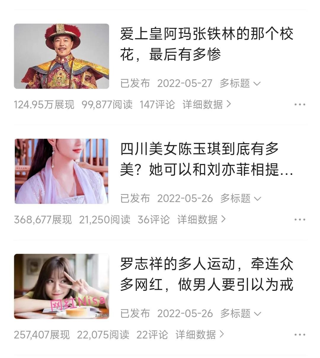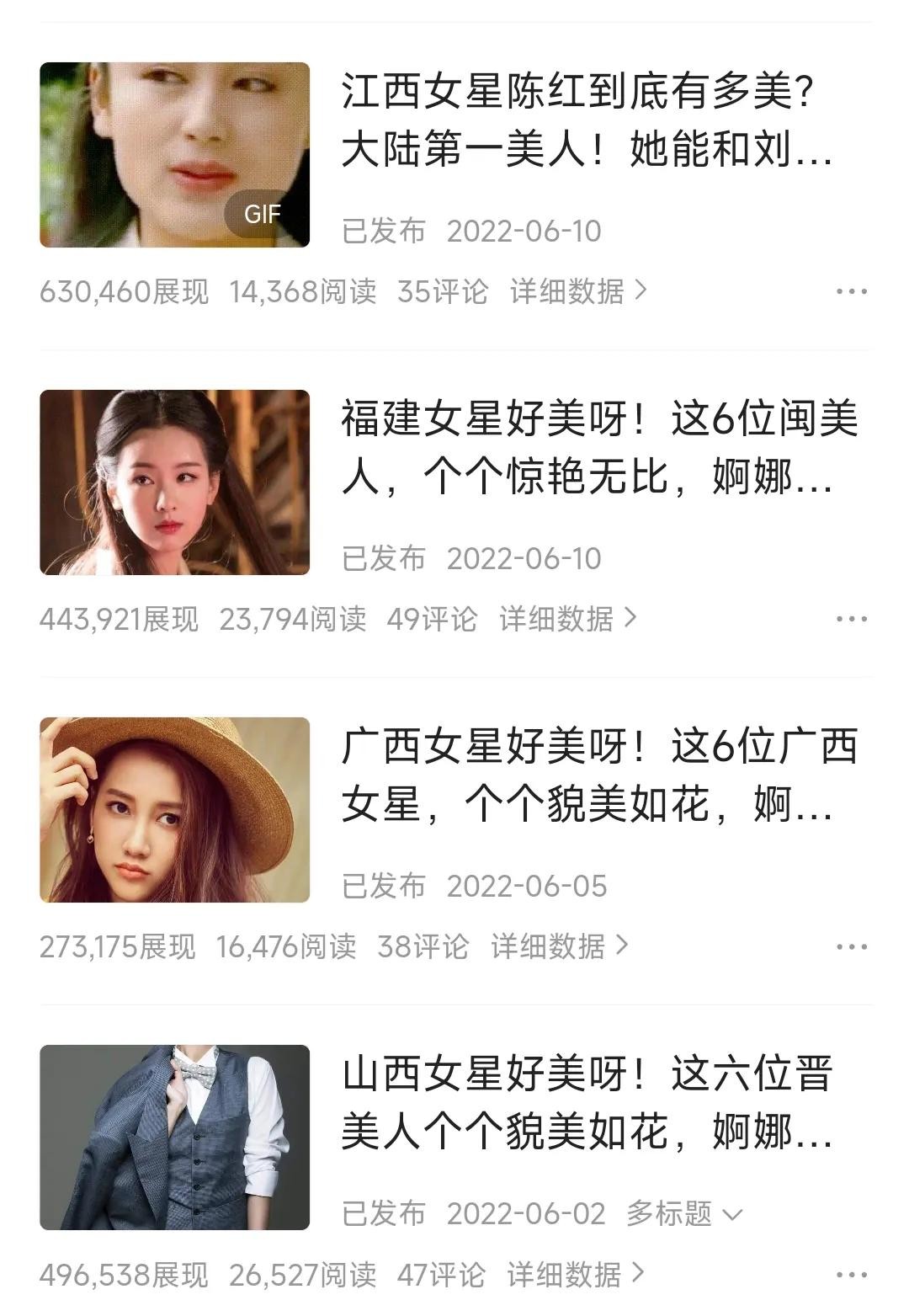 后来又学别人写娱乐明星。大概出来十篇左右的一万以上阅读的文章。然后自己又换领域了因为自己了解的娱乐明星就那么几个。