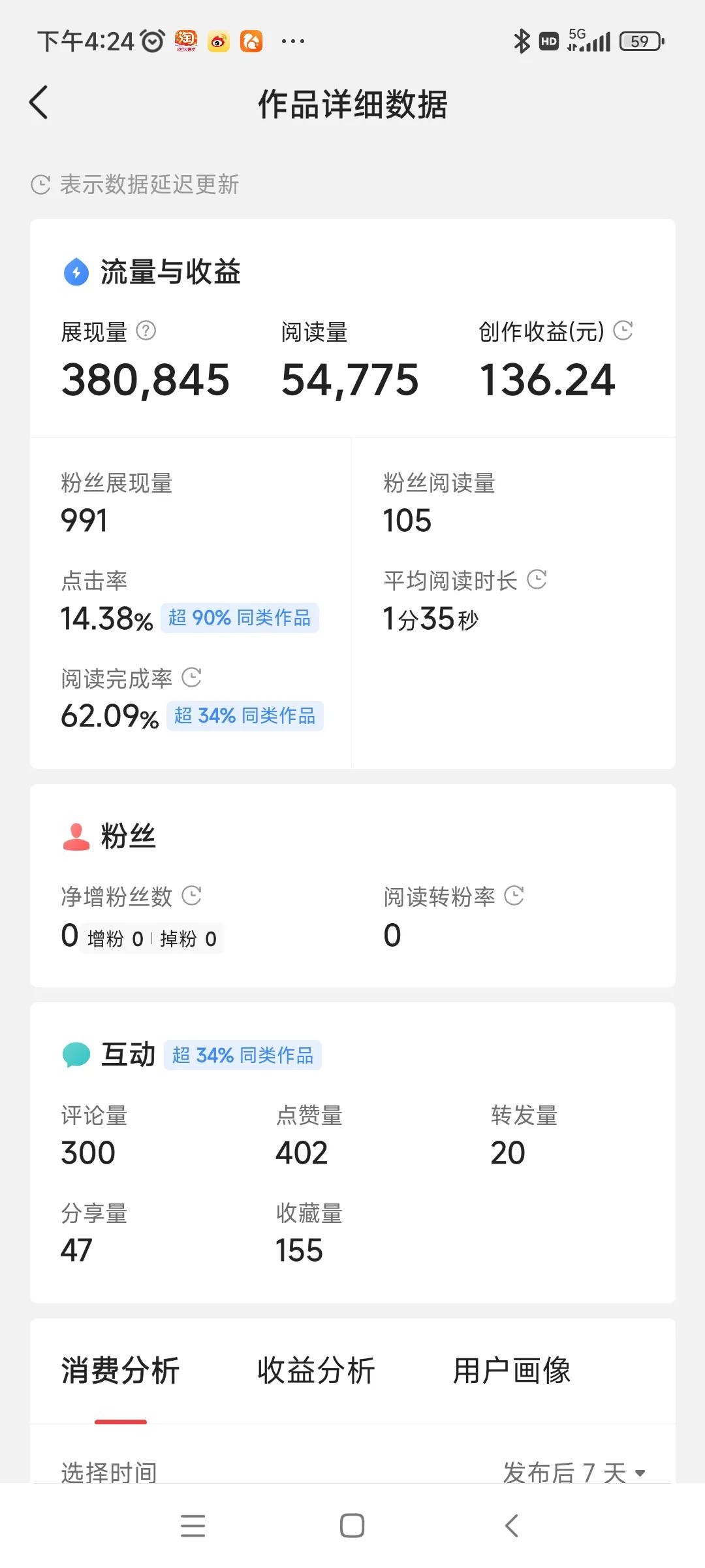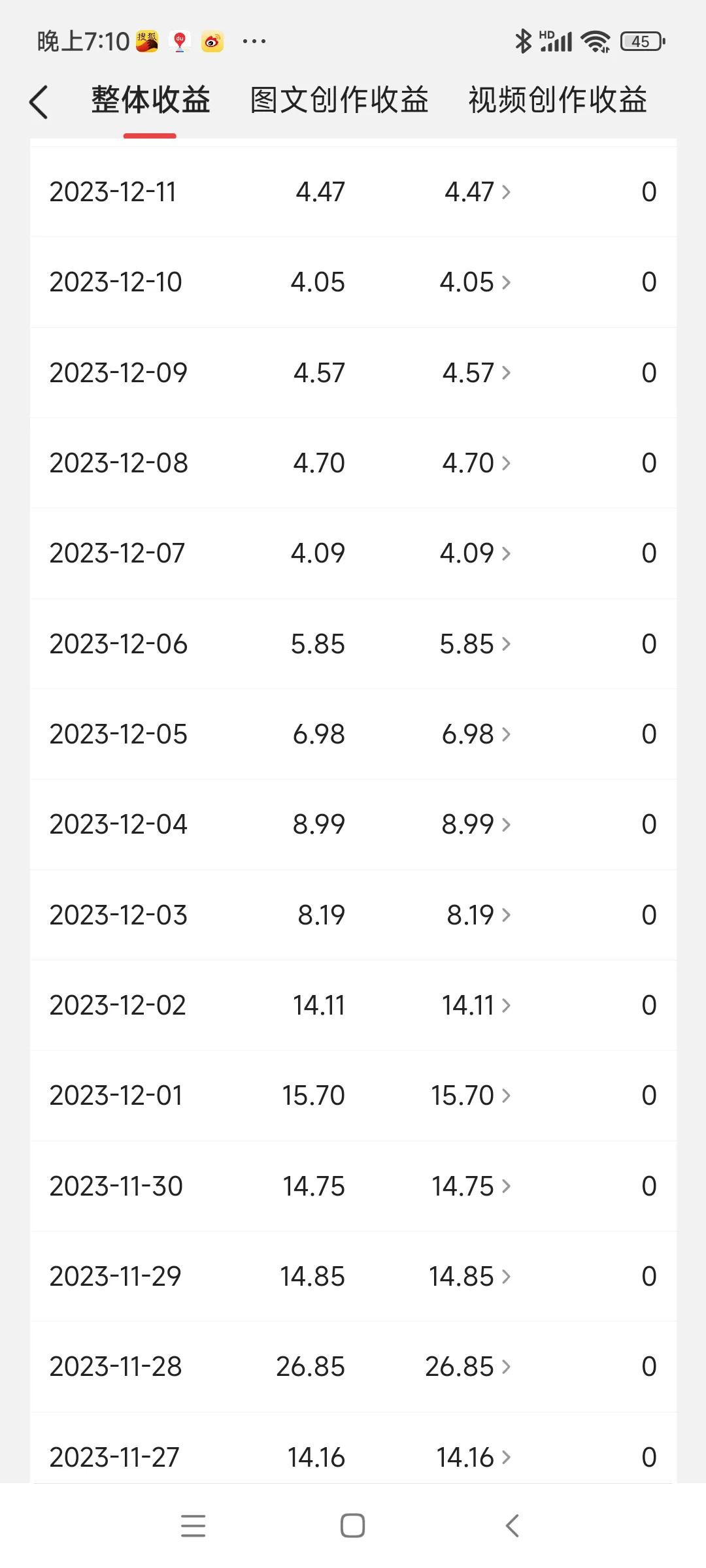 这样的收益恐怕还不如捡破烂吧。但是可比捡破烂费劲多了。那些告诉你写文章赚钱多么轻松的人不是坏就是更坏。写文章是脑力活,搜肠刮肚那种焦虑可比捡破烂苦多了。会因为写不出来文章而烦躁,会因为辛辛苦苦花几个小时写出来的一篇文章只有个位数的流量而苦闷。当然也会因为突然的爆款而狂喜。哪怕爆款的收益只有几块钱,你也喜极而泣。