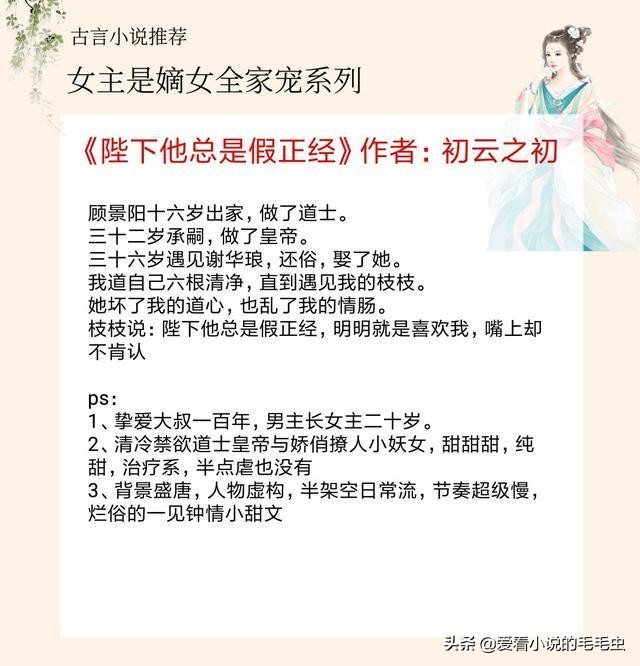 总之女主真·撩人精,从小宠到大,男主虽是皇帝,但因曾修道的缘故,不近女色,男女主相差20岁,日常向甜文,无虐,活泼爱闹的谢华琅遇见了年长她诸多的郎君,终于也有了能降住她的人。世界这么大,你来得刚刚好。作者文笔流畅,语言优美,没有传统意义上的高潮迭起,却在平淡之中展露出脉脉温情,男主温柔体贴,女主活泼可爱,彼此互补,相得益彰,温馨甜蜜,引人入胜。5本女主是嫡女全家宠的古言,女主从小被宠到大,温馨无比!