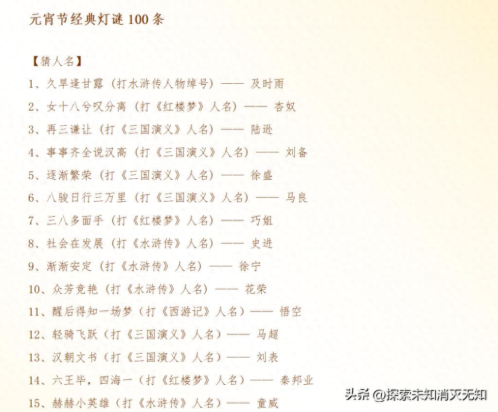 特精选了100条妙趣横生、涵盖各类知识的元宵节灯谜及其答案,邀您一同感受这份独特的文字游戏魅力,体验中华民族传统节日文化的博大精深。