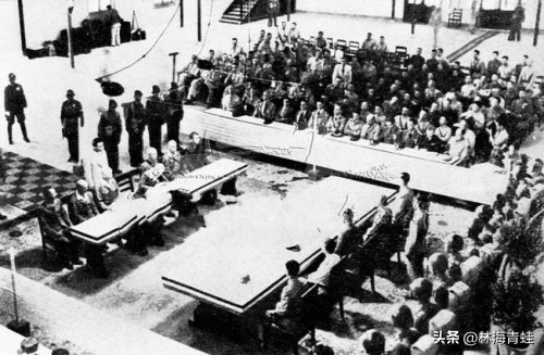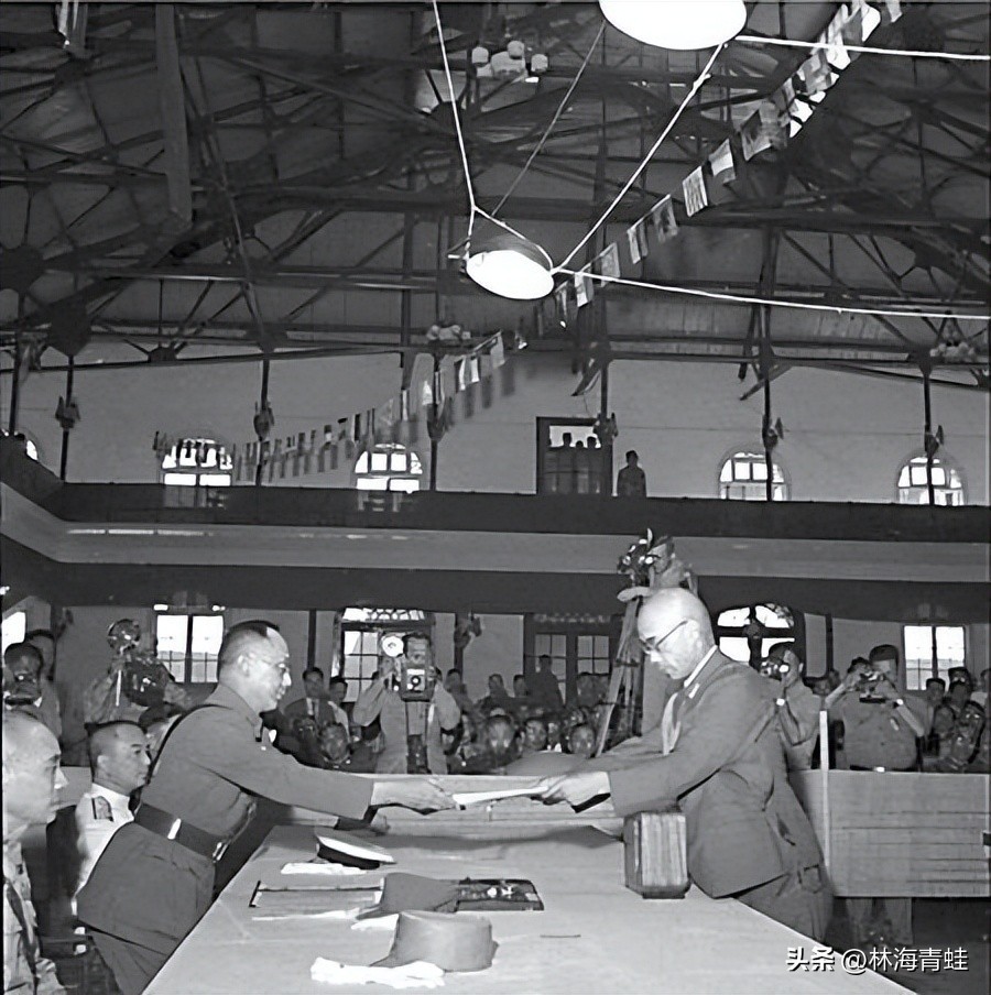 冈村宁次心情复杂地用毛笔在投降书上签字并盖上自己的名章,由其参谋长小林浅三郎双手呈递给中国陆军总司令何应钦,由于投降席桌面过于宽大,何应钦不得不起身双手迎接,这一历史性时刻被记者抓拍了下来,只是由于何应钦身体过于前倾而饱受非议,并被诟病至今,真可谓是细节决定成败啊。