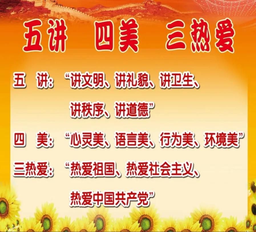 1981年,总工会、共青团联合向全国人民特别是青少年发出倡议,开展以:讲文明、讲礼貌、讲卫生、讲秩序、讲道德和心灵美、语言美、行为美、环境美为主要内容的“五讲四美”文明礼貌活动。三热爱”是指热爱祖国、热爱社会主义、热爱人民。
