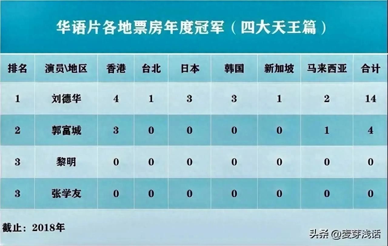 香港四大天王全球年度票房,刘德华总计14部,郭富城4部,黎明呢