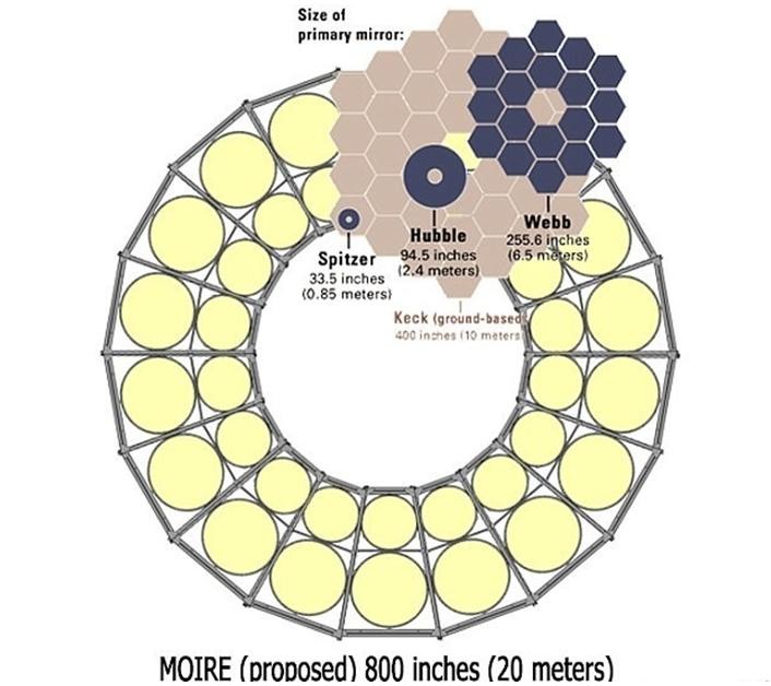 ▲图中分别是"哈勃"和"韦伯"望远镜镜片,以及"摩尔"镜片的对比