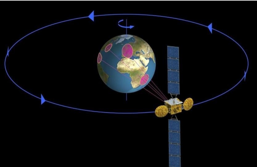 ▲地球同步轨道又称静止轨道,此时卫星和地球同步运行,从地面来看相对静止