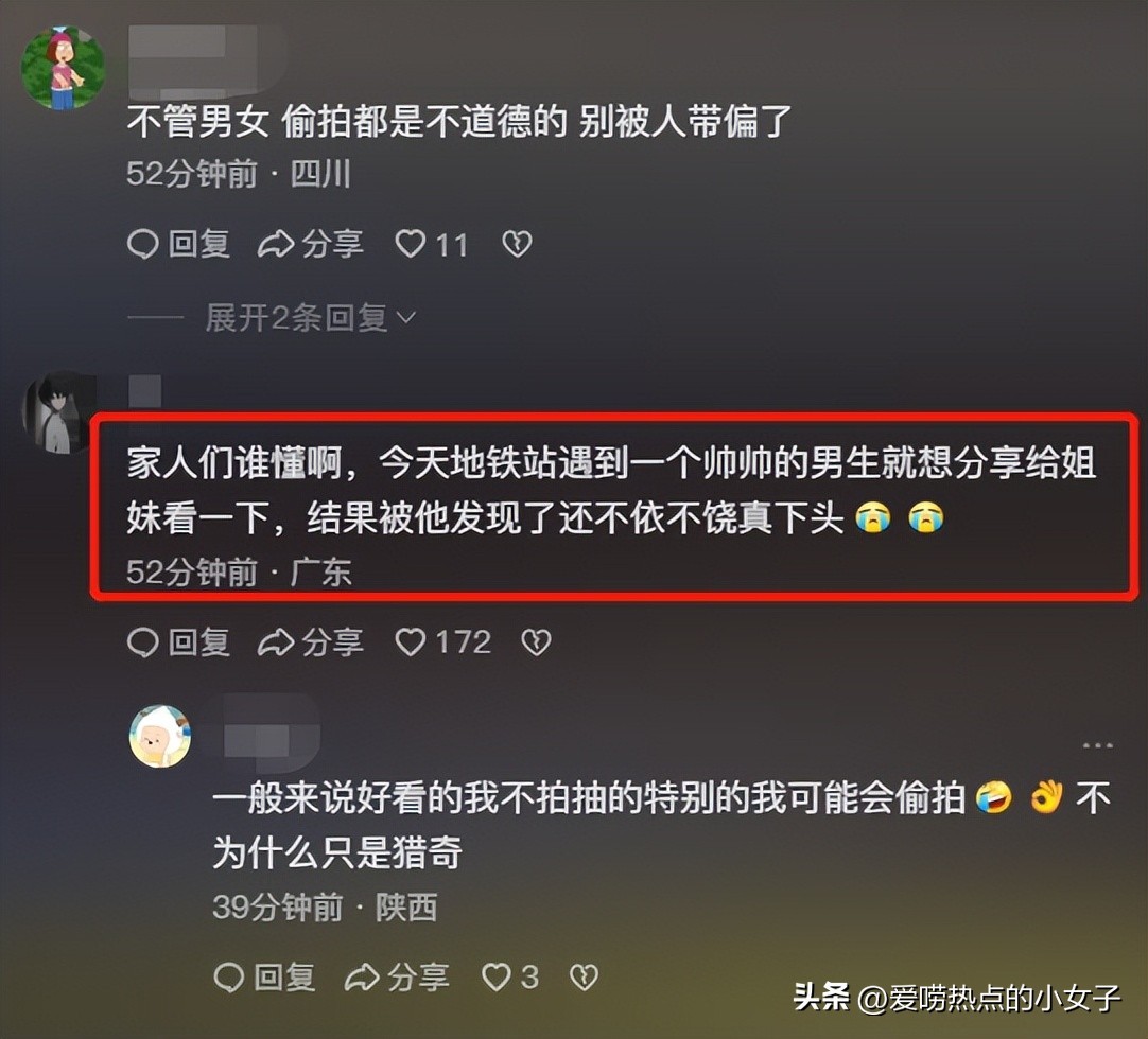 更有网友调侃道:“家人们谁懂啊,今天地铁站遇到一个帅帅的男生就想分享给姐妹看一下,结果被他发现了还不依不饶真下头!”