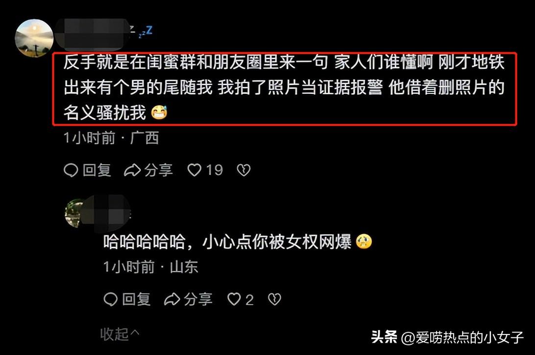 他表示:“女生反手就是在闺蜜群和朋友圈里来一句,家人们谁懂啊,刚才地铁出来有个男的尾随我,我拍了照片当证据报警,他借着删照片的名义骚扰我”