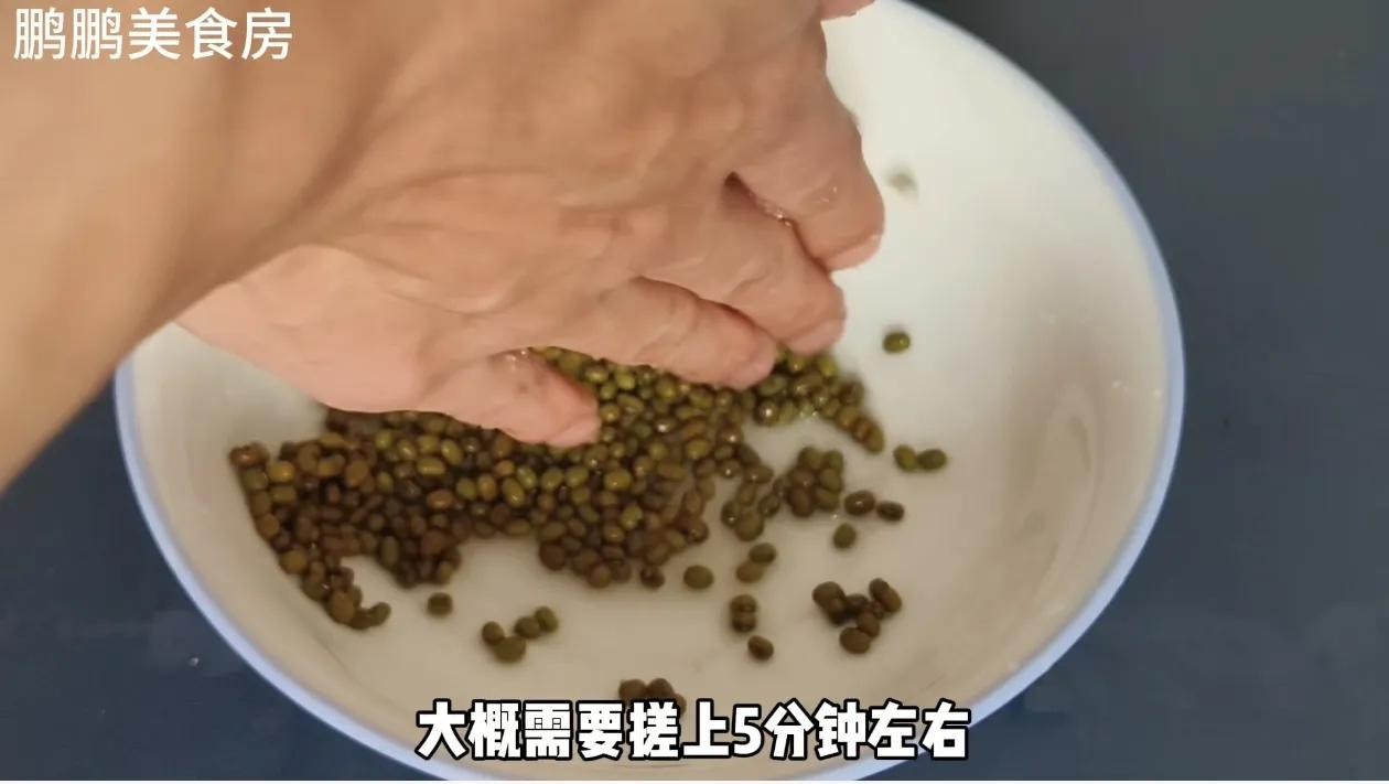 这样就会有利于绿豆更快的开花,软烂,但是我们一定要搓久一点,大概需要搓上5分钟左右,这一步我们一定要有耐心哦,搓好之后我们再加入水,然后把绿豆淘洗干净即可,当然了,如果你时间充裕,在煮之前也可以把绿豆泡上1到2个小时,这样也可以在煮的时候有利于绿豆快速开花,只是比较浪费时间而已。