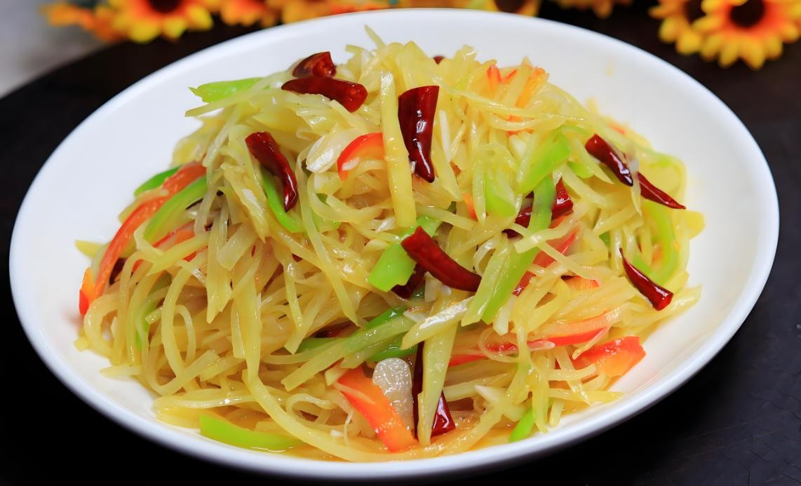 酸辣土豆丝口感爽脆,酸辣开胃。土豆切丝后放入水中浸泡,去除淀粉。锅中热油,放入葱姜蒜和干辣椒爆香,再放入土豆丝翻炒。加入醋、盐、鸡精等调料,快速翻炒均匀。这道菜是很多家庭餐桌上的常客,酸辣的味道总能让人胃口大开。