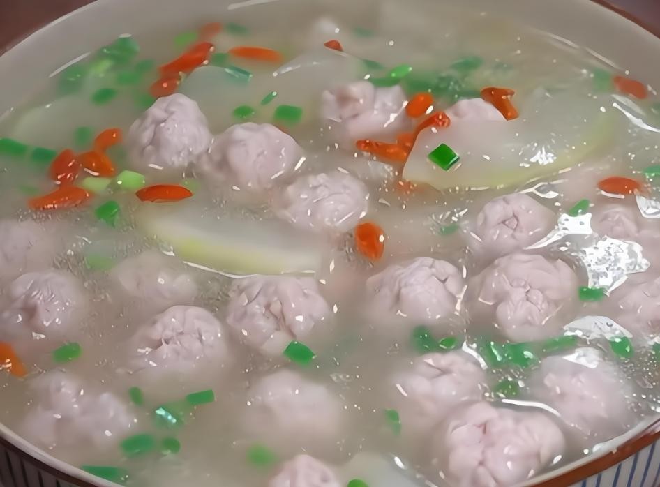 冬瓜肉丸汤肉丸鲜嫩,冬瓜软烂。先将猪肉剁碎,加入葱姜末、盐、淀粉等调料制成肉丸。冬瓜去皮切块。锅中烧开水,放入肉丸煮至浮起,再加入冬瓜一起炖煮。汤清味美,营养丰富,是一道清爽可口的汤品。