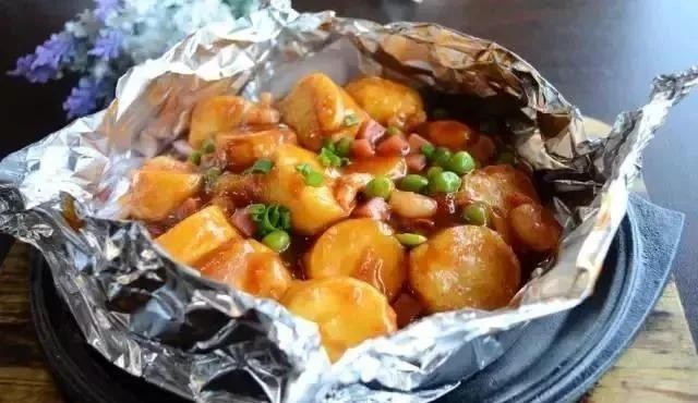 3、将锡纸包成正方形,包口朝下放入铁板上以小火加热,待锡纸鼓起上桌。