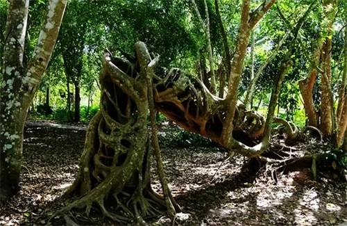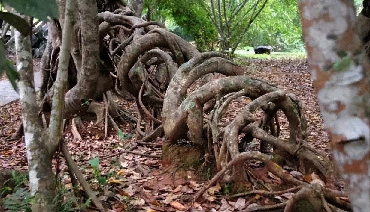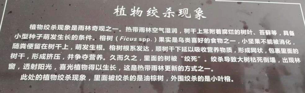 首先,绞杀植物的幼苗附生于“支柱植物”上,长出气生的网状根系包围树干并向下扩展,直到伸入地下生成正常根系。从土壤中吸收养分后生长加快,网状根膨大并愈合为网状茎,支柱植物则被绞杀致死。
