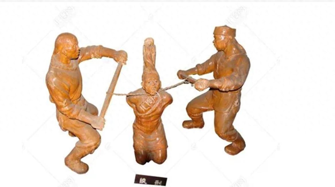 最初的绞杀是让犯人坐在一块平台上,手系在腹前背靠着一根竖着的木桩,刽子手从木桩上的窟窿中放进去一根麻绳,编成环将犯人脖子套住,再将麻绳的两端在桩的另一面打结,从中插入一根棍。当转动棍子时,环收紧使犯人被勒死。这种方式丝毫不伤颈动脉,却造成人慢慢窒息而死。