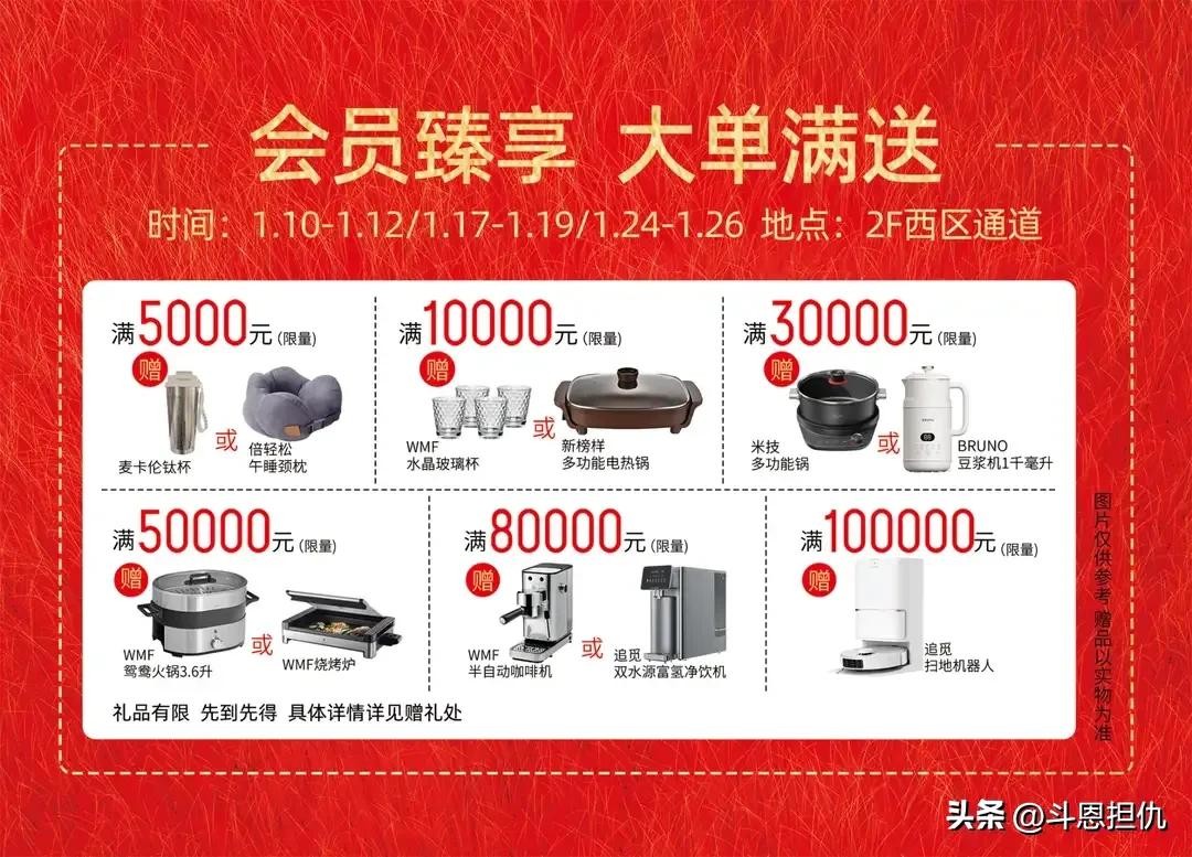 会员专享好礼:会员福利丰富多样,消费满5000送麦卡伦TK535毫升钛杯或倍轻松午睡颈枕;满1万送WMF水晶玻璃杯4支或新榜样多功能电热锅;满减至高送德龙EMAX咖啡机。数量有限,先到先得。