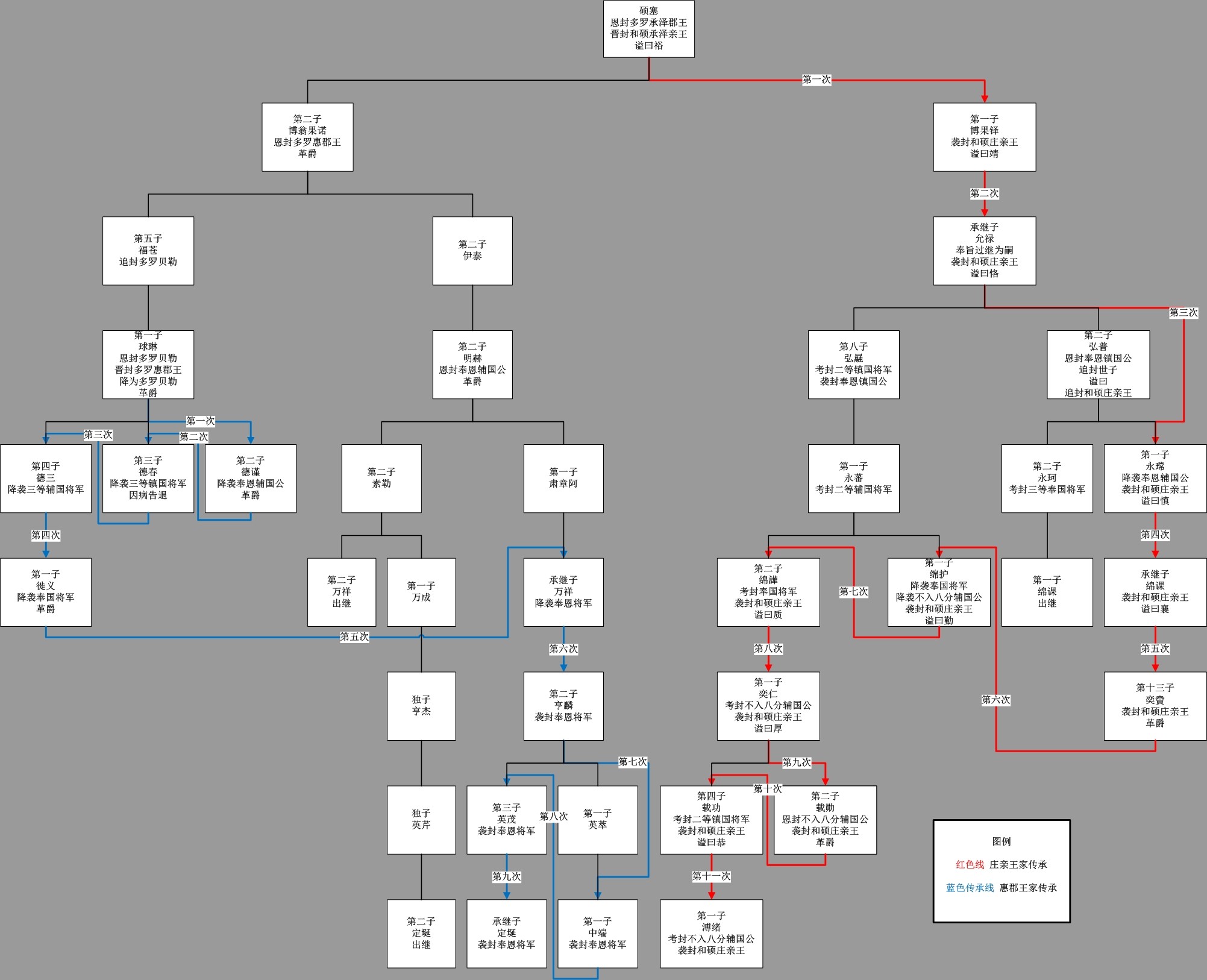 硕塞共有四个儿子,其中第一子博果铎和第二子博翁果诺为嫡出,第三子鞥额布为庶出,第四子夭折。故而大宗由嫡长子博果铎继承,而嫡出的次子博翁果诺也作为别宗得到了入八分的爵位,庶出的鞥额布则只被封为辅国将军。
