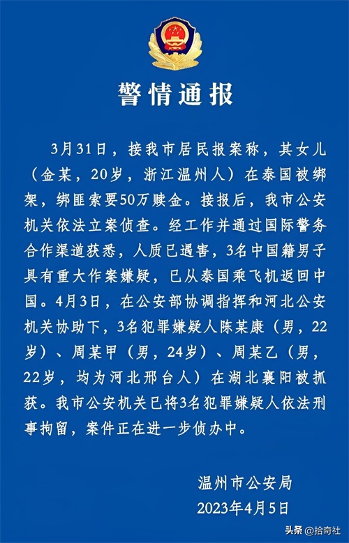 同一天,温州市公安局也发布了警情通报,确认周某甲等三名凶嫌绑架杀人,以及被捕的事实,并表示案件正在进一步侦办中。