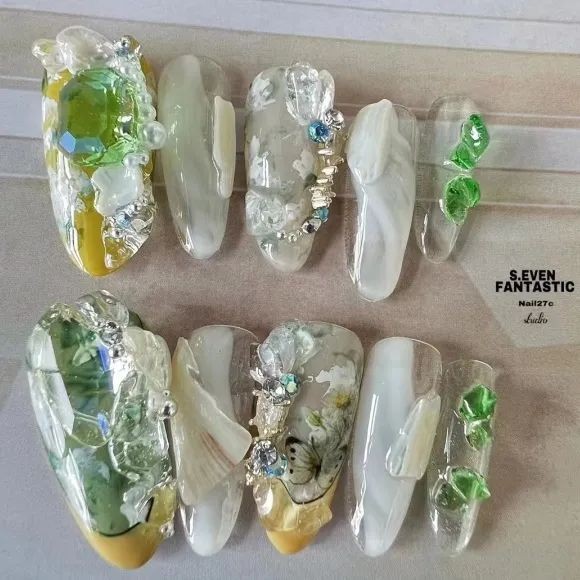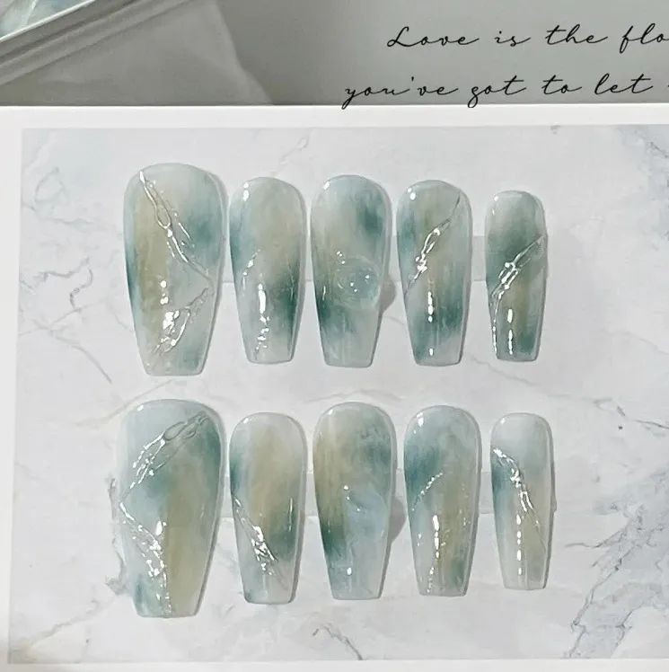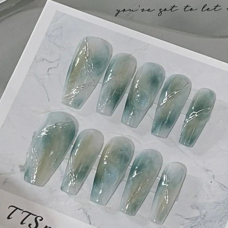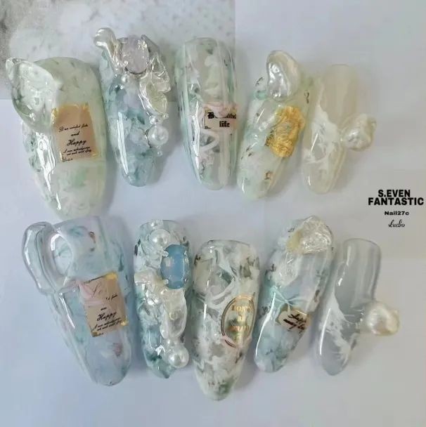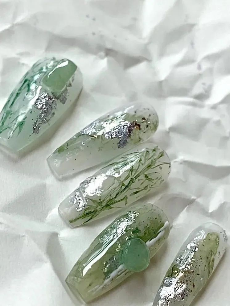 跟上面水润润的翠绿不同,这种加了乳色的绿更像是晶莹剔透的翡翠玉石,做这个美甲岂不是直接拿捏住大小姐的温润气质。