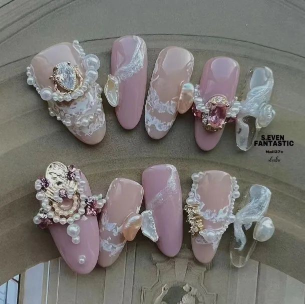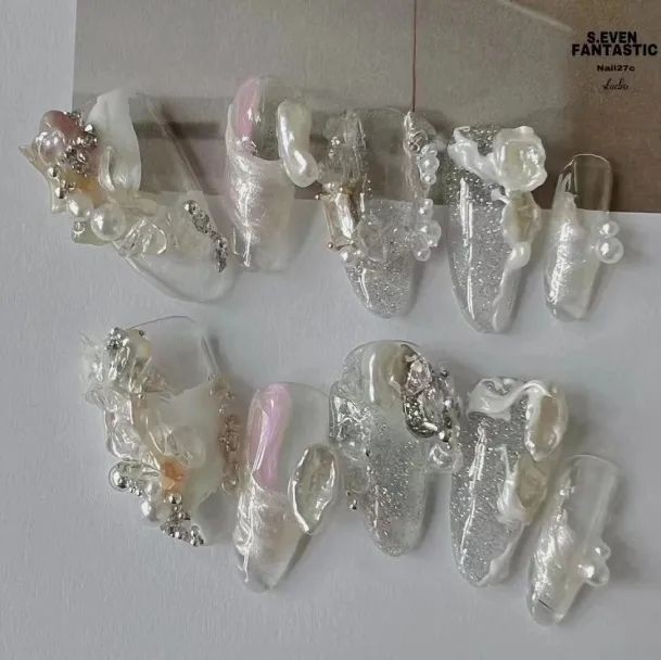 尤其是不规则珍珠排列成不规则的形状,跃然在指尖上就像一幅油画,像米色、纯白色这些饱和度极低的颜色,直接就能把复古感和温柔感拉满。