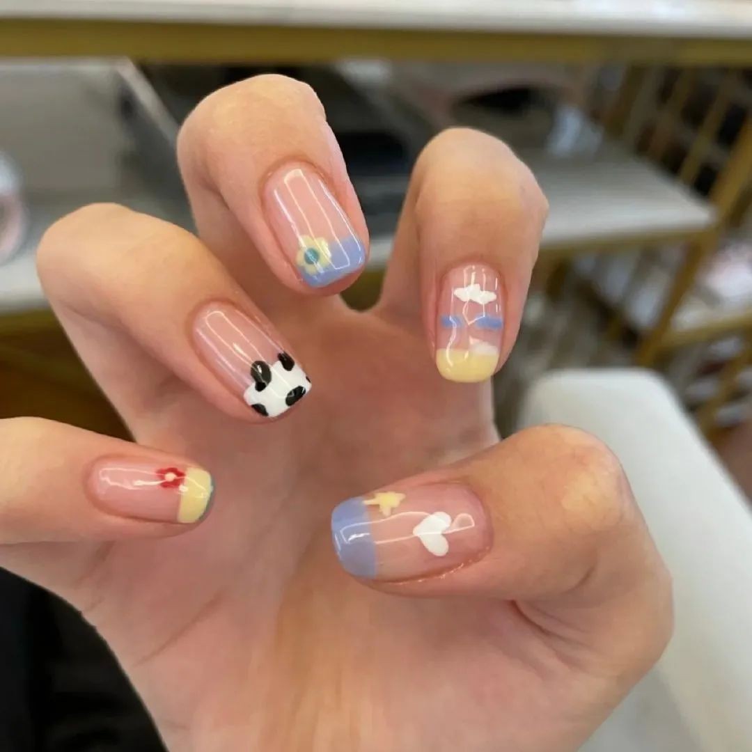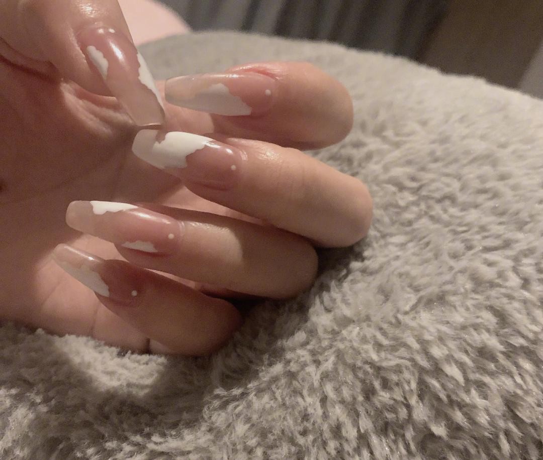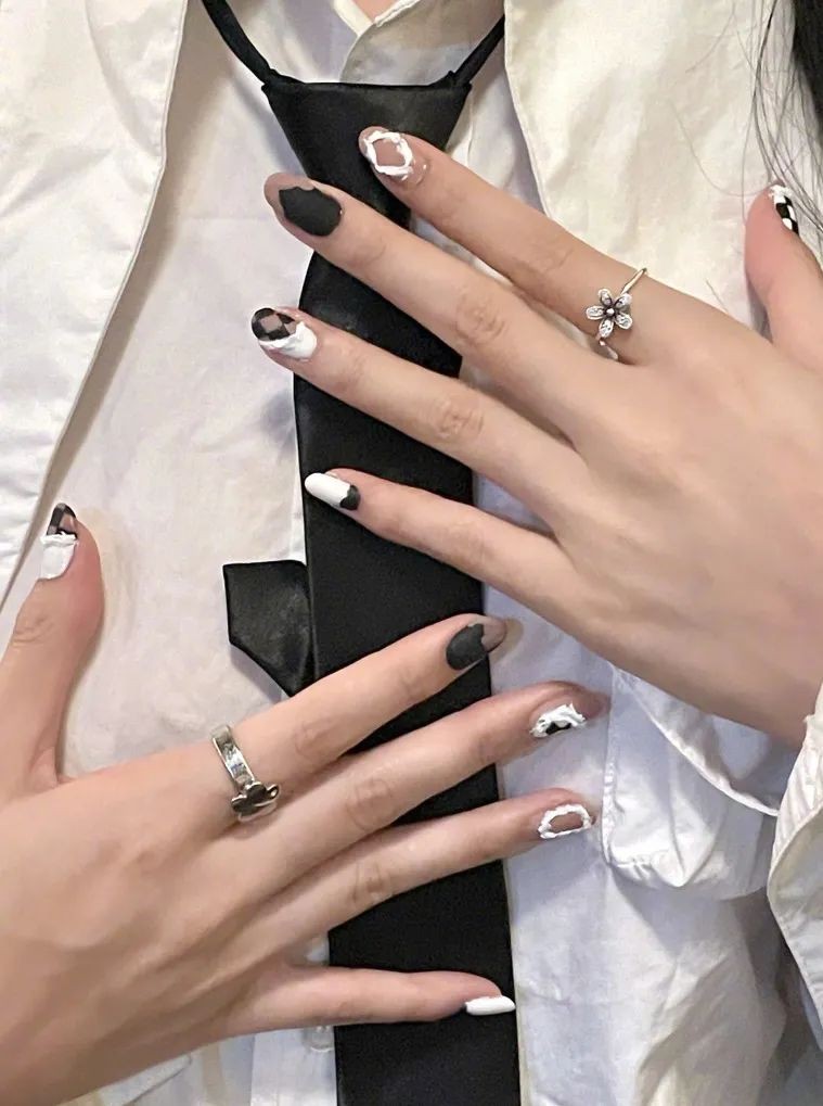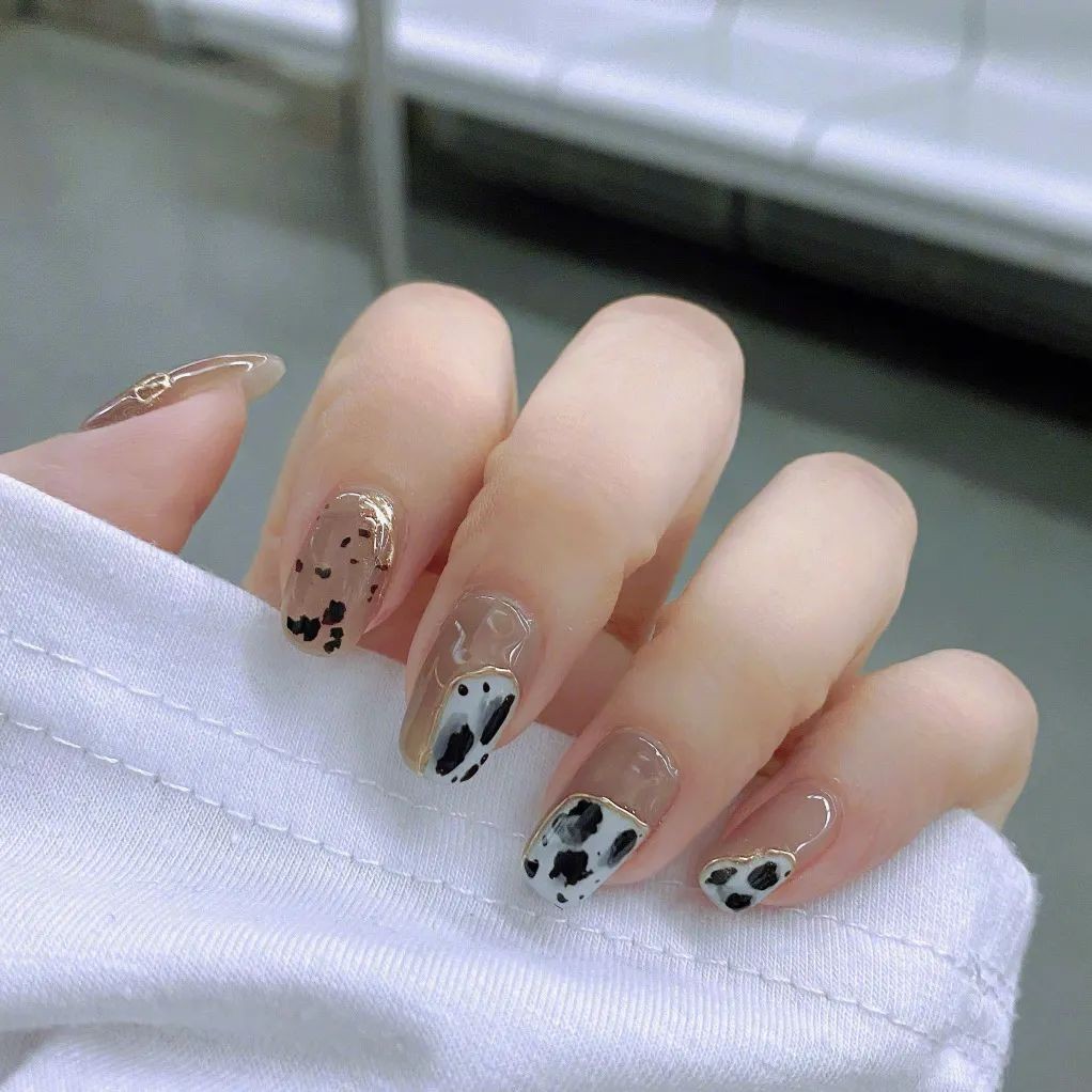 想要独特一点的姐妹也可以试试看不规则形状白色奶牛纹,冰透甲显得整个指甲都干净清爽起来,只是简单的颜色也可以简约高级。