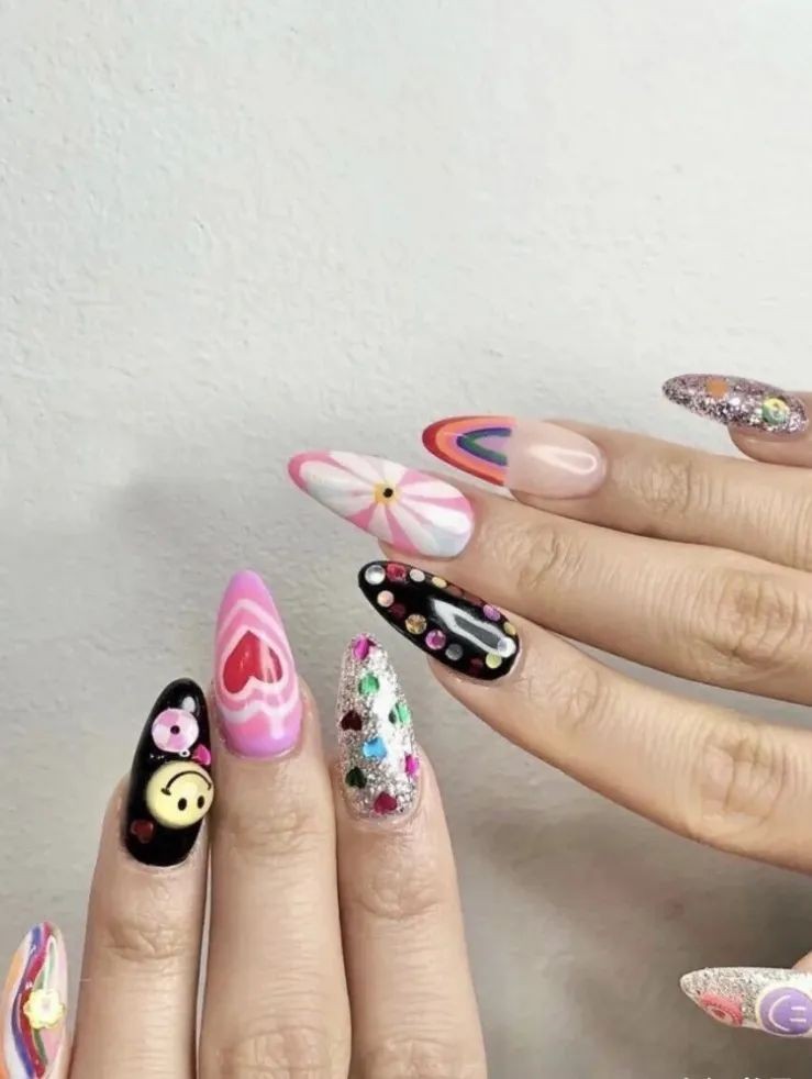 她的美甲子几乎都是辣妹炫酷风格的,而且大部分都是短甲,很适合不想贴甲片的姐妹们参考~