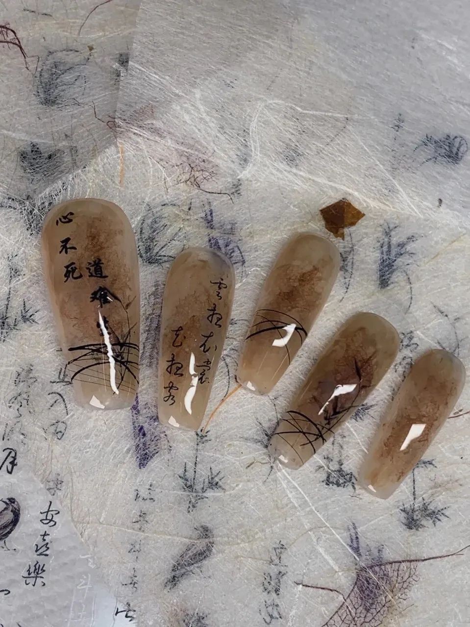 新中式美甲的感觉跟冰透甲其实差不多,不过新中式主要是添加一些文字和山水画的元素在里面,就形成了非常鲜明的中式风格。