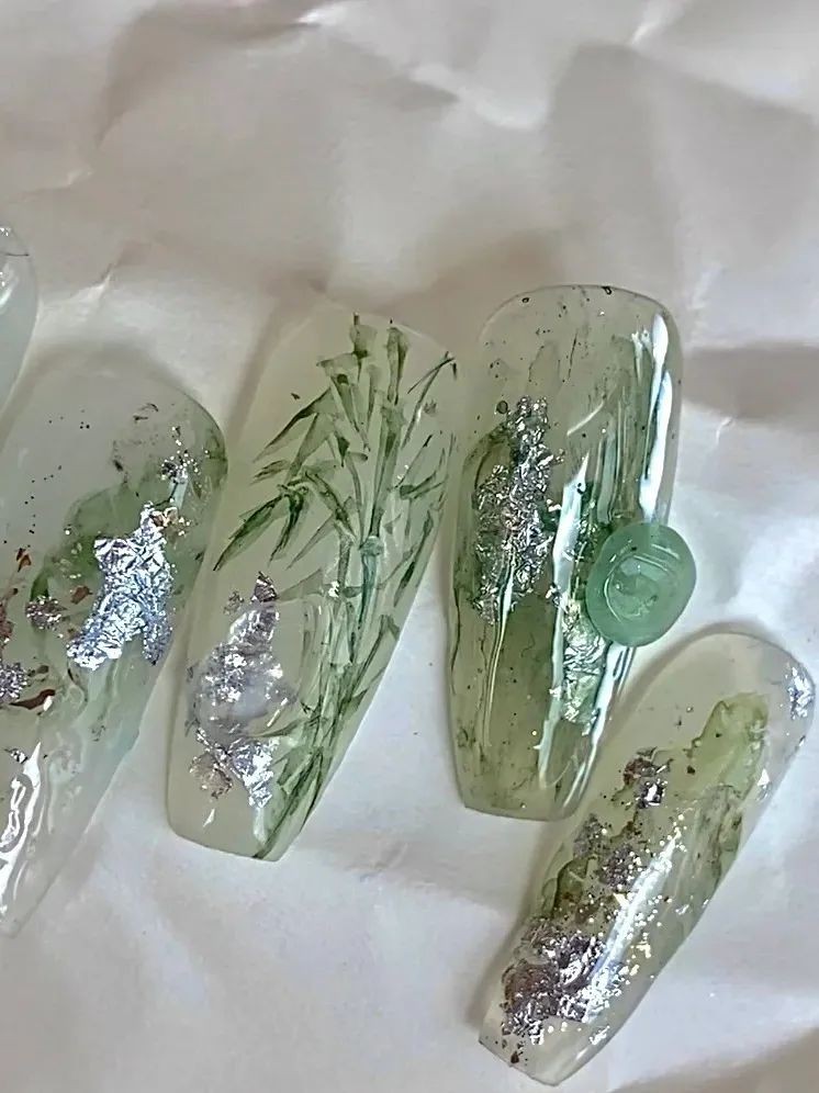 竹子也是新中式美甲的一大重要元素,翠绿的竹叶和一两颗玉石的点缀把雅致拉到了顶级,这么清凉的颜色,太适合夏天了吧!