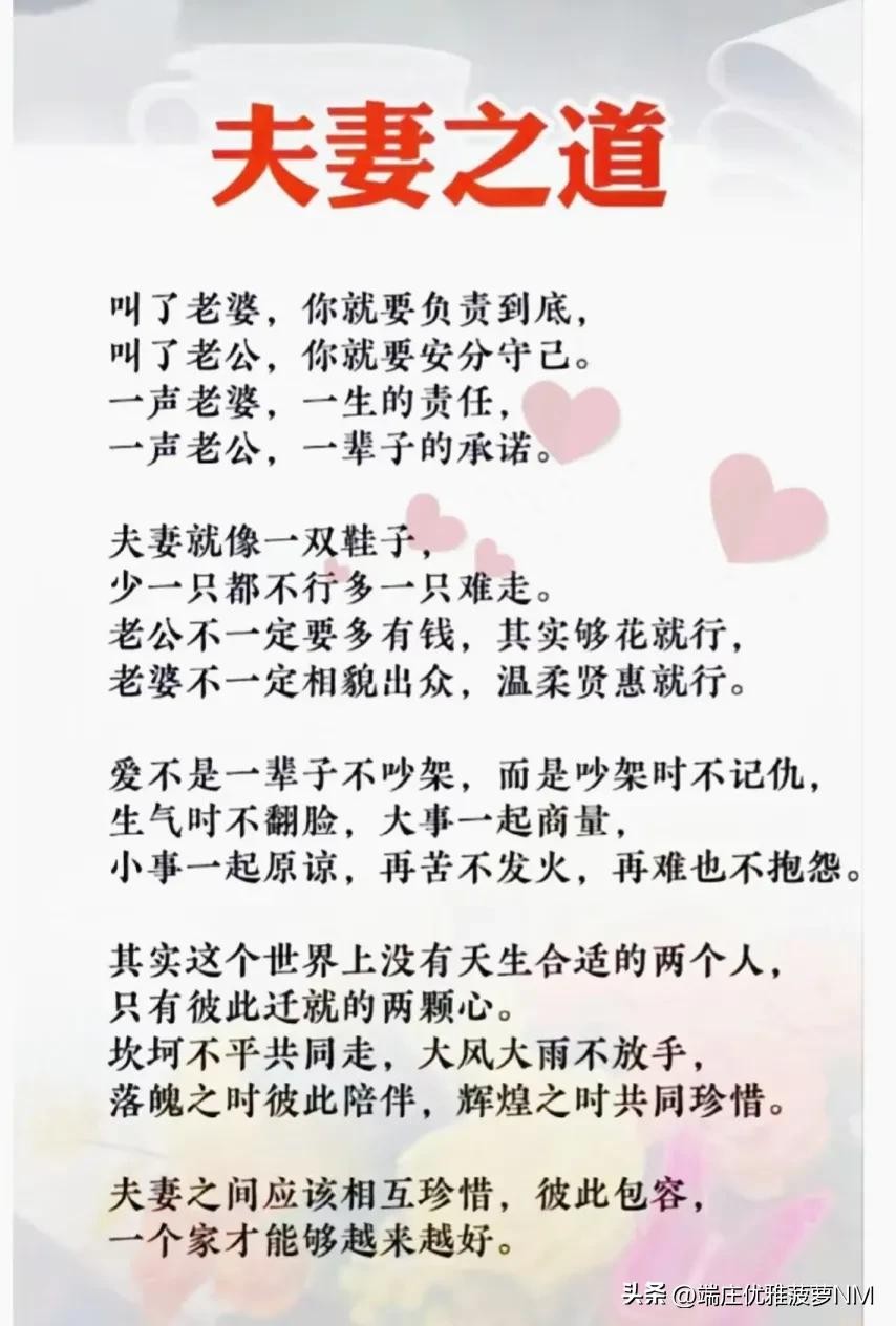 4. 促进社会和谐:夫妻关系的和谐稳定有助于促进社会的和谐。在和谐的夫妻关系中,双方能够更好地互相理解和尊重,减少社会矛盾和冲突,从而有助于促进社会的和谐。